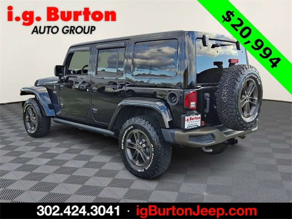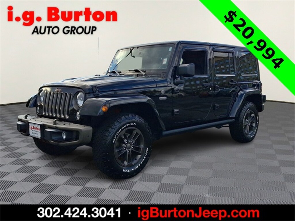 *CPOGO WARRANTY, !!!((( SEE IT AT THE MILFORD JEEP LOCATION!!!)))!!!, ***THIS VEHICLE IS SCHEDULED TO LEAVE FOR MANHEIM AUTO AUCTION AND IS BEING OFFERED AT WHOLESALE PRICE, Wrangler Unlimited Sahara, 4D Sport Utility, 3.6L V6 24V VVT, 5-Speed Automatic, 4WD, Black Clearcoat, Black Leather, 2 Front & 1 Rear Bronze Tow Hook, 75th Anniversary Badge, Anti-Spin Differential Rear Axle, Body Color Grille w/Bronze Accent, Bronze Jeep Grille Badge, Bronze Trail Rated Badge, Chrome/Leather Wrapped Shift Knob, Class II Receiver Hitch, Connectivity Group, Heated Front Seats, Hood w/Power Dome, Jeep 75th Anniversary Package, Leather Seat w/Cloth (Ombre Mesh), Leather Wrapped Steering Wheel, Low Gloss Black Wrangler Decal, MOPAR Slush Mats, Moroccan Sun Instrument Panel Bezel, Moroccan Sun Interior Accents, Painted Front Bumper, Painted Rear Bumper, Premium Black Sunrider Soft Top, Quick Order Package 24H 75th Anniversary, Radio: 430, Remote USB Port, Sunrider Soft Top, Tire Pressure Monitoring Display, Trailer Tow Group, Trailer Tow w/4-Pin Connector Wiring, Uconnect Voice Command w/Bluetooth, Vehicle Information Center, Wheels: 17 x 7.5 Aluminum Bronze. 2016 Jeep Wrangler Unlimited Sahara Odometer is 26747 miles below market average! Since 1908, i.G. Burton Auto Group has served Delmarva and its surrounding communities with outstanding sales and service as its longest-standing family-owned and operated dealer group. See why we proudly say, "Nobody Beats a Burton Deal! NOBODY!"