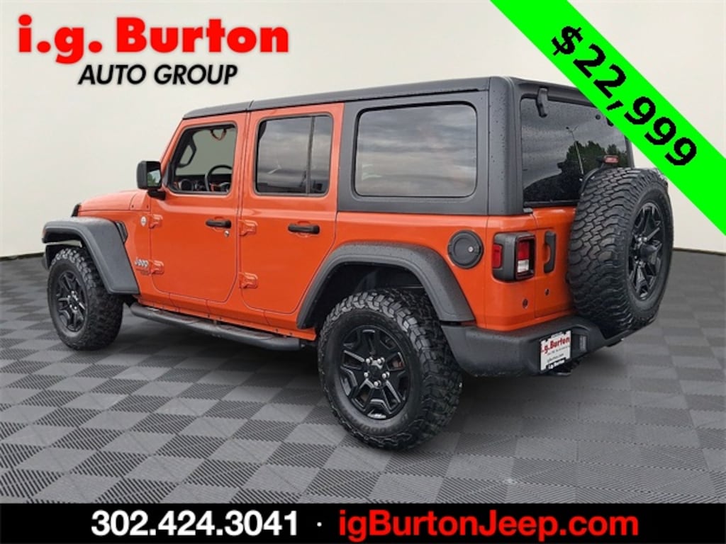 *CERTIFIED, !!!((( SEE IT AT THE MILFORD JEEP LOCATION!!!)))!!!, ***THIS VEHICLE IS SCHEDULED TO LEAVE FOR MANHEIM AUTO AUCTION AND IS BEING OFFERED AT WHOLESALE PRICE, Wrangler Unlimited Sport S, 4D Sport Utility, 2.0L I4 DOHC, 8-Speed Automatic, 4WD, Punkn Metallic Clearcoat, Black Cloth, Automatic Headlamps, Deep Tint Sunscreen Windows, Front 1-Touch Down Power Windows, Leather Wrapped Steering Wheel, Power Heated Mirrors, Quick Order Package 22S Sport S, Remote Keyless Entry, Security Alarm, Speed Sensitive Power Locks, Sun Visors w/Illuminated Vanity Mirrors, Wheels: 17" x 7.5" Tech Silver Aluminum. 2020 Jeep Wrangler Unlimited Sport S Odometer is 6010 miles below market average! Since 1908, i.G. Burton Auto Group has served Delmarva and its surrounding communities with outstanding sales and service as its longest-standing family-owned and operated dealer group. See why we proudly say, "Nobody Beats a Burton Deal! NOBODY!"